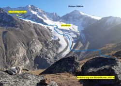 Von der Hütte geht es in einer Stunde zum Marzellkamm hinauf, von dem man dann wieder 200 Hm auf die Gletschermoräne absteigt. Beim Rückweg ist das ein Gegenanstieg, der zwar nochmal Schweiß fördert, aber nicht allzu steil ist (der frühere Weg, der ohne Höhenverlust zum Gletscher führte, ist teilweise abgebrochen und deshalb gesperrt). Anschließend steigt man den mittleren Teil des Gletschers hinauf und wendet sich dann nach Süden, um den spaltenreichen Teil zu umgehen. Danach zieht man länger anhaltend Richtung Osten zum Einstieg der Flanke.