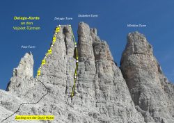 Allen voran steht die Delagokante hoch im Kurs. Neben der Stegerkante (Sella), Schleierkante (Pala) und Dibonakante (Große Zinne) zählt sie zu den meistbegangenen Kletterrouten in den Dolomiten. Es handelt sich um eine sehr steile und exponierte Gratschneide, die linkerhand schwindelerregend mehrere hundert Meter teilweise überhängend abfällt. Also nichts für schwache Nerven … vor allem auch was die Absicherung betrifft.