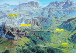 Pera di Fassa im Fassa-Tal. Parkplatz beim Sessellift „Gardeccia, Vajolet, Rosengarten“ in der Ortsmitte.