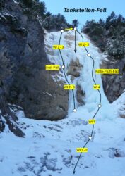 Es ist die einfachste Möglichkeit durch den Tankstellen-Fall zu klettern. Kurze Stufen wechseln sich mit kleinen Absätzen ab. Das Eis kann stellenweise etwas dünn sein, deshalb sind kürzere Eisschrauben vorteilhaft. 2 Seillängen mit jeweils WI 2 – 3 sind Programm. Am Ende trifft man auf eine Felswand und quert über ein Band diagonal nach rechts zum Abseilstand an Normalhaken, die mit Schlingen verbunden sind.