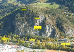 Nach der 3. Seillänge mündet die Linie in den „Galugg-Klettersteig“, über den dann noch ein gutes Stück weiter geklettert wird. Hier gibt es eine linke bzw. rechte Variante. Bei der rechten Variante sind noch ein paar etwas schwerere Sporklettertouren mitten in der Wand eingerichtet.