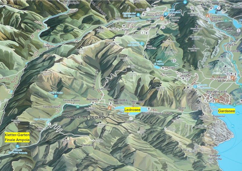 Im hintersten Winkel des Einzugsgebiets von Arco, genauer gesagt am westlichen Ende des Ledrosee-Tals, gibt es den Klettergarten „Finale Ampola“. Das Gebiet ist lediglich in Insiderkreisen bekannt, da es doch einige Kilometer vom Gardasee zum Ampola-Pass hinauf sind. Doch wer den langen Weg in Kauf nimmt, wird mit einigen schönen Sportkletterrouten belohnt.