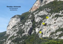 Wie auch bei Tessari sind hier die Wände gelegentlich verwachsen, der Fels ist dennoch rau und bietet viele schöne Klettermeter. So auch in der „Paradiso Artificiale“ am Sektor „Pale Basse“. Die Linie führt links eines markanten Daches vorbei und leitet mit steiler Wandkletterei bis zum höchsten Punkt des Massivs hinauf.