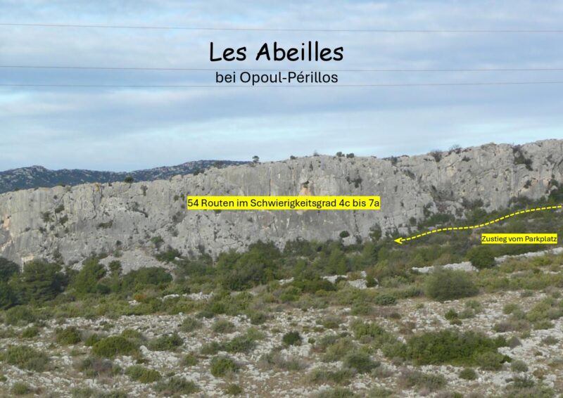 Der breitgezogene Felsriegel bietet insgesamt 54 Kletterrouten im Schwierigkeitsgrad 4c bis 7a, wobei der Schwerpunkt bei 5b bis 6b liegt. Es handelt sich um ein sehr eindrucksvolles, landschaftlich schönes Klettergebiet mit kompaktem Fels. Je weiter man am Wandfuß hinabsteigt, desto länger werden die Routen bis zu 30 Meter. Die südseitige Lage gewährt den ganzen Tag Sonne. Inmitten der hochgelegenen Maccia reicht der Blick bis zu den Pyrenäen und zum Mittelmeer hinaus. Das Klettergebiet liegt unter der Burg von Opoul-Périllos. Man fährt zwischen Vingrau und Opoul die steile Straße Richtung Burg hinauf. Noch vor dem obersten Burg-Parkplatz führt eine holprige Piste nach links zum Klettergarten-Parkplatz mit guter Übernachtungsmöglichkeit im Van und dgl. Von hier sind es nur wenige Minuten bis zu den ersten Kletterrouten.