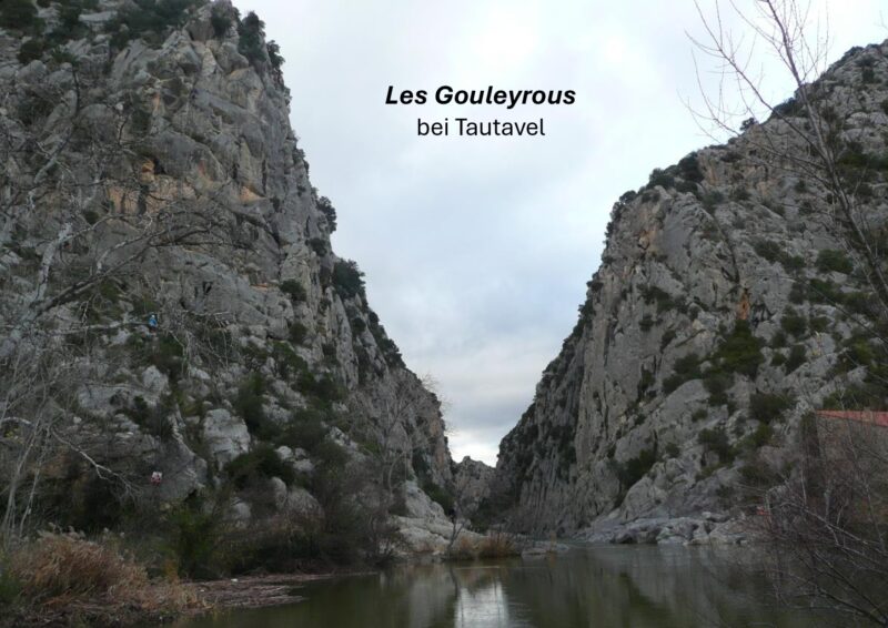 Einer der touristischen Magneten von Tautavel ist die Schlucht „Les Gouleyrous“. Zwischen den hohen Felswänden zwängt sich ein Fluß hindurch, der sich im Sommer zum Baden eignet. Beidseitig des teilweise mit Drahtseilen versicherten felsigen Ufers gibt es in 14 Sektoren 176 Routen in allen Schwierigkeitsgraden. Der Schwerpunkt liegt bei 6a aufwärts. Bei hohem Wasserstand liegt der Wandfuß unter Wasser und manche Routen sind dann nicht mehr zu erreichen. Am Schluchteingang gibt es auf der linken Seite im Sektor „Initation“ auch viele leichte Linien im Bereich 3a bis 6a. Der kompakte Kalk bietet viele Schlitze, Löcher und Henkel. Hier ist der Zustieg recht kurz, deshalb sind die Routen gut besucht. Wegen dem schönen Ambiente gehört die Schlucht zum Pflichtprogramm eines Kletterurlaubs. Am Parkplatz befindet sich ein prähistorisches Freiluft-Museum mit urzeitlichen Funden, was sich nach dem Klettern anbietet. Das Gebiet liegt zwischen Tautavel und Vingrau.