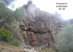 Schon von Weitem ist der Mone Gozzi an der Westküste bei Afa sichtbar. Großes, verlockendes Massiv, schlechte Parkmöglichkeiten im suspekten Villenviertel, Zustieg auf dem Pfad durch die Maccia. Bei genauerer Betrachtung ist der ganze Berg von Flechten übersät. Wir haben wirklich fast alles abgegrast und wenige nichteinladende Einstiege gefunden. Dennoch werden einige Routen im rechten vorgelagerten Wandteil gelobt (???). Dorthin zu gelangen, muss auch erst mal gefunden werden oder gleicht einer Odyssee durch’s Gestrüpp. Am Rückweg haben wir glücklicherweise den Klettergarten „Le petit Gozzi“ unterhalb des Massivs gefunden und mit ein paar schönen Touren im Bereich 6a/b war dieser Tag doch noch gerettet.