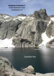 Die Route war der Höhepunkt unseres Urlaubs und eines meiner schönsten Klettererlebnisse überhaupt. Bereits der Zustieg über der den Melosee zum Capitellosee ist landschaftlich phantastisch und führt entlag von Cascaden und Granitstufen. Der Einstieg zur Route leitet über ein Stahlseil über das Seeufer und man hat Mühe, dabei nicht nass zu werden. Danach folgt tolle gut gesicherte Wand- und Plattenkletterei, mit einem phantastischen Tiefblick auf den Capitellosee. Abseilen über die Route, das Stahlseil kann umgangen werden.