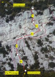 Zudem ist die Miralago sehr abwechslungsreich, da sie mit einer Verschneidung, Platten und steiler Wandkletterei divers durch die Wand zieht. Herzstück ist ein genussvoller 30 Meter langer Quergang an Untergriffsschuppen, der auch eine variable Stehtechnik erfordert. Nach oben hin spitzt sich die Tour immer mehr zu und führt über einen athletischen Überhang in eine plattige Wand. Hier geht es nochmal richtig zur Sache und verlangt beherzte Freikletterei, um die letzten Klettermeter zu meistern.