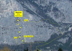Während die älteren Routen bereits gut abgeklettert sind und erste Speckspuren zeigen, ist die „Wegrama“ weitaus weniger bekannt und deshalb fast noch im Urzustand. Die Erstbegeher haben hier fleißige Putzarbeit geleistet, gehämmert, Graspolster entfernt und einen kletterbaren Weg über geneigte Platten und steile Aufschwünge kreiert. So sind auch einige Quergänge entstanden und die Moves sind nicht immer gleich erkennbar.
